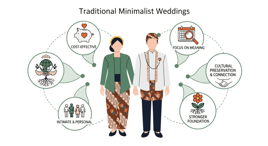 Pernikahan minimalis memiliki beberapa manfaat yang dapat dinikmati oleh pasangan yang menikah. Pertama, pernikahan minimalis dapat memberikan kesan yang sangat romantis dan intim. Kedua, pernikahan minimalis dapat menghemat biaya dan waktu. Ketiga, pernikahan minimalis dapat memberikan kesempatan bagi pasangan untuk mengekspresikan diri dan kreativitas mereka.