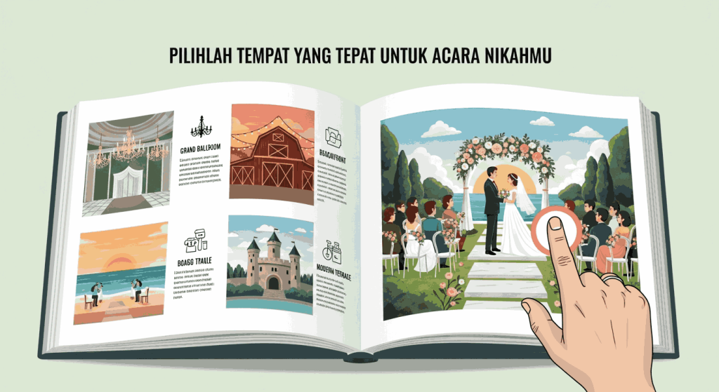 Anda dapat memilih salah satu dari tempat tersebut untuk pernikahan Anda. Pastikan Anda telah mempertimbangkan kapasitas, fasilitas, dan harga tempat sebelum mengambil keputusan.